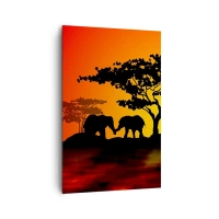 Obraz na płótnie - Sylwetki słoni o zachodzie słońca nad wodą z odbiciem - 80x120cm - A wieczorem na małego drinka - Nowoczesna dekoracja ścienna do salonu i sypialni ARTTOR