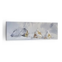 Obraz na płótnie - Zimowy krajobraz z chatą i stogami siana w górach - 160x50cm - W śnieżnej kotlinie - Nowoczesna dekoracja ścienna do salonu i sypialni ARTTOR