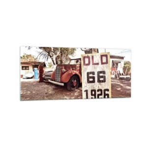 Obraz na szkle - Retro samochód i znak Route 66 w rustykalnym otoczeniu - 120x50cm - Legenda amerykanskiej prowincji - Nowoczesna dekoracja ścienna do salonu i sypialni ARTTOR