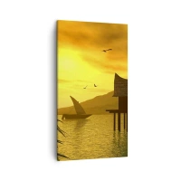 Obraz na płótnie - Tropikalny zachód słońca nad wodą z drewnianym domkiem na palach. - 80x120cm - Upragniony spokój - Nowoczesna dekoracja ścienna do salonu i sypialni ARTTOR