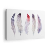 Obraz na płótnie - Pięć delikatnych piór w pastelowych odcieniach na jasnym tle - 70x50cm - Delikatne jak różnobarwna mgła - Nowoczesna dekoracja ścienna do salonu i sypialni ARTTOR