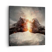 Obraz na płótnie - Dwie zaciśnięte pięści z eksplozją ognia - 50x70cm - Stań do walki - Nowoczesna dekoracja ścienna do salonu, kuchni i sypialni ARTTOR