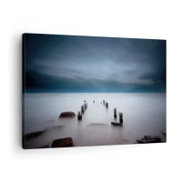 Obraz na płótnie - Drewniane pale w morzu pod zachmurzonym niebem - 50x70cm - Zamyślone jezioro - Nowoczesna dekoracja ścienna do salonu, kuchni i sypialni ARTTOR