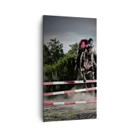 Obraz na płótnie - Jeździec na koniu przeskakujący przez przeszkodę na torze wyścigowym - 80x120cm - Razem po zwycięstwo - Nowoczesna dekoracja ścienna do salonu i sypialni ARTTOR
