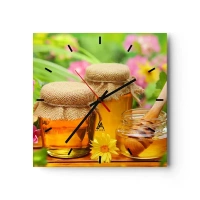 Obraz na szkle - Słoiki miodu z kwiatami na tle letniego ogrodu - 80x120cm - Słodko i kwiatowo - Nowoczesna dekoracja ścienna do salonu i sypialni ARTTOR