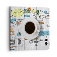 Obraz na szkle - Filiżanka kawy na tle schematów i rysunków koncepcyjnych - 50x70cm - Czas na przerwę - Nowoczesna dekoracja ścienna do salonu, kuchni i sypialni ARTTOR