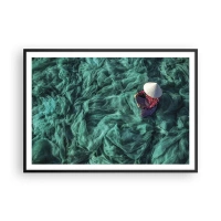 Plakat w czarnej ramie - Osoba z kapeluszem wśród zielonych sieci rybackich - 100x70cm - W morzu sieci - Nowoczesna dekoracja ścienna do salonu i sypialni ARTTOR