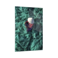 Obraz na szkle - Osoba z kapeluszem wśród zielonych sieci rybackich - 80x120cm - W morzu sieci - Nowoczesna dekoracja ścienna do salonu i sypialni ARTTOR