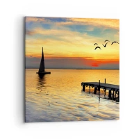 Obraz na płótnie - Zachód słońca z żaglówką i molo nad spokojnym jeziorem - 120x80cm - Wieczorne powroty - Nowoczesna dekoracja ścienna do salonu, kuchni i sypialni ARTTOR