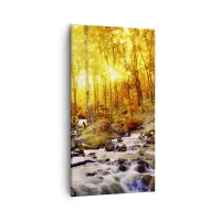 Obraz na płótnie - Jesienny las z potokiem wśród złotych liści - 80x120cm - Kamienie oprawne w złoto i platynę - Nowoczesna dekoracja ścienna do salonu i sypialni ARTTOR