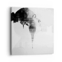 Obraz na płótnie - Portret kobiety z konturami miasta w tle, czarno-białe barwy - 70x50cm - Po dwóch stronach szyby - Nowoczesna dekoracja ścienna do salonu i sypialni ARTTOR