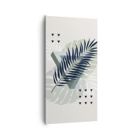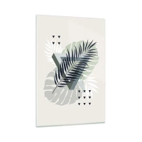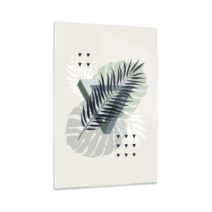 Obraz na szkle - Geometryczna kompozycja z tropikalnymi liśćmi w odcieniach zieleni - 80x120cm - Natura i geometria – dwa porządki? - Nowoczesna dekoracja ścienna do salonu i sypialni ARTTOR