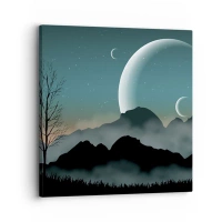 Obraz na szkle - Księżyce nad górami z samotnym drzewem i gwiazdami - 70x50cm - Karnawał gwiaździstej nocy - Nowoczesna dekoracja ścienna do salonu i sypialni ARTTOR