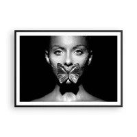 Plakat w czarnej ramie - Czarno-biała twarz kobiety z motylem na ustach - 100x70cm - Motyli pocałunek - Nowoczesna dekoracja ścienna do salonu i sypialni ARTTOR