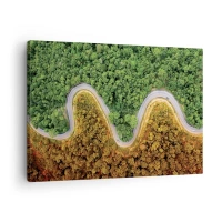 Obraz na płótnie - Zakręcona droga przez las widziana z lotu ptaka - 70x50cm - Granice i przełomy - Nowoczesna dekoracja ścienna do salonu i sypialni ARTTOR