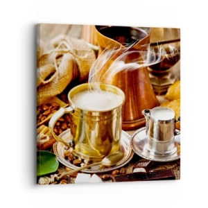 Obraz na płótnie - Złoty kubek z gorącą kawą otoczony ziarnami i miedzianymi akcesoriami - 50x70cm - Miłego dnia! - Nowoczesna dekoracja ścienna do salonu, kuchni i sypialni ARTTOR