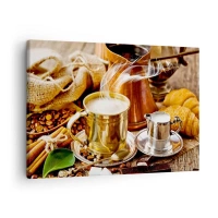 Obraz na płótnie - Złoty kubek z kawą w otoczeniu ziaren, dzbanuszków i croissantów - 70x50cm - Miłego dnia! - Nowoczesna dekoracja ścienna do salonu i sypialni ARTTOR
