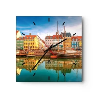 Zegar ścienny - Kolorowe kamienice nad kanałem w Kopenhadze - 30x30cm - Nad wodą gładką jak lustro - Nowoczesna dekoracja ścienna do salonu i sypialni ARTTOR