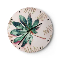 Zegar ścienny - Duży zielony liść na jasnoróżowym tle z detalami roślinnymi - 30x30cm - Studium zieleni na różowym tle - Nowoczesna dekoracja ścienna do salonu, kuchni i sypialni ARTTOR