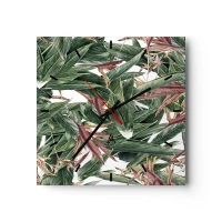 Zegar ścienny - Dekoracyjny motyw liści w odcieniach zieleni i bordo na jasnym tle - 30x30cm - Szmaragdowo-liliowy gąszcz - Nowoczesna dekoracja ścienna do salonu i sypialni ARTTOR