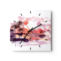 Zegar ścienny - Tropikalny pejzaż z palmami o zachodzie słońca w akwareli - 30x30cm - Spokój tropików w czerwieni - Nowoczesna dekoracja ścienna do salonu i sypialni ARTTOR