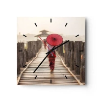 Zegar ścienny - Kobieta z czerwonym parasolem na drewnianym moście - 30x30cm - Na starym moście - Nowoczesna dekoracja ścienna do salonu i sypialni ARTTOR